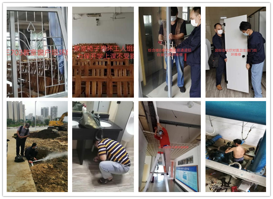 持续做好各类修缮工作。疫情期间,维修中心员工不忘职责使命,在做好防护措施的同时,积极投入到维修、抢修工作之中,做了大量的修繕工作,为学校开学提供了可靠的条件保障。先后完成教学楼、办公楼等卫生间门、铝合金大门维修;完成教室桌椅和门窗、综合楼吊顶坍塌的吊顶维修;完成学校主泵房维保、新区施工现场水管抢修、卫生间用水设备维修,等等。