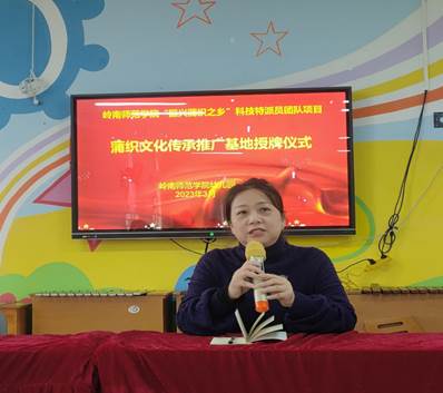 3月29日,岭南师范学院“振兴蒲织之乡”科技特派员团队项目组与幼儿园举行了蒲织文化传承推广基地授牌仪式。出席授牌仪式的有岭南师范学院美术与设计学院服装系主任项目组负责人沈晶照副教授、项目组成员法政学院李德深书记、美术与设计学院服装系同学,幼儿园各班教师党员代表等。