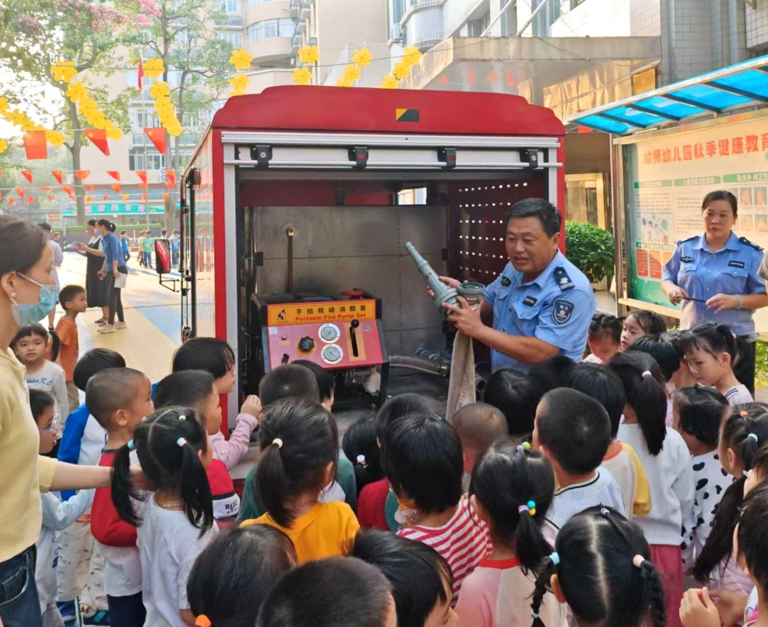 活动的最后,师生们还参观了消防车。工作人员耐心地向师生们介绍了消防车的构造、功能以及车上各种消防器材的用途。孩子们不时地提出问题,工作人员都一一进行解答,让他们对消防车和消防工作有了更深入的了解。为了让师生们了解更多的消防知识,学校安保处还向幼儿园赠送了消防知识书籍。