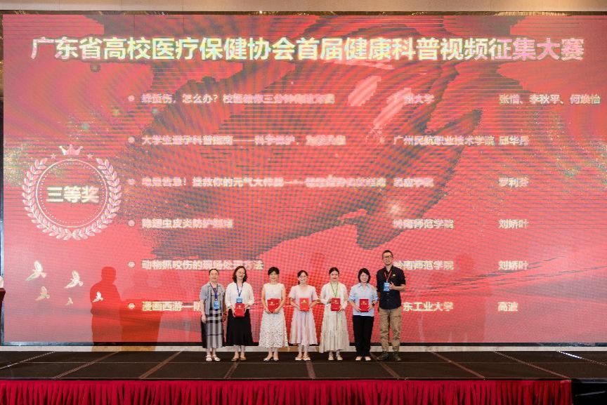 为进一步促进健康知识的传播与普及,提升高校师生健康素养,门诊部党支部发挥基层党组织堡垒作用,支部书记带领党员骨干及入党积极分子组建参赛团队,积极参与广东省高校医疗保健协会举办的首届健康科普视频征集大赛。大赛面向全省各高校医疗机构医务工作者于2025年4月-6月开展,分为初审、网络投票、终审三个环节,经过激烈角逐,学校参加的三个视频作品在全省30家高校78个作品中脱颖而出,其中《癫痫发作的现场处理方法》作品荣获二等奖,《隐翅虫皮炎防护指南》及《动物抓咬伤的现场处理方法》作品荣获三等奖,学校同时荣获“优秀组织奖”,获奖率100%居全省高校之冠,同时也刷新了门诊部的获奖记录,受到了各兄弟院校同行的高度赞赏。
