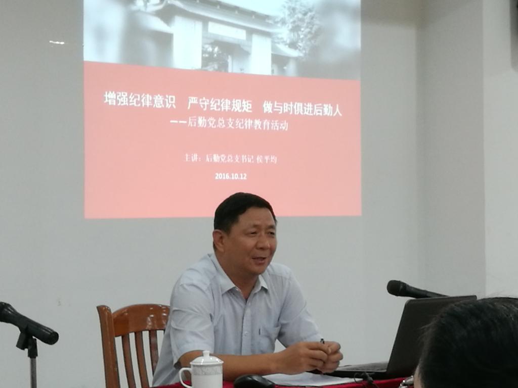 为深入推进纪律教育学习活动, 10 月 13 日下午后勤党总支在学校学术交流中心三楼会议室举办了由全体正式员工参加的纪律教育月学习活动。后勤党总支书记侯平均作了“增强纪律意识,严守纪律规矩,做与时俱进后勤人”的专题辅导报告。