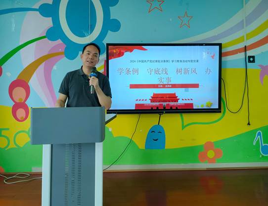 为增强幼儿园全体党员政治定力、纪律定力、道德定力、抵腐定力,始终做到忠诚干净担当,后勤党总支第四党支部于7月3日上午在幼儿园会议室开展党纪学习教育,邀请后勤管理处副处长吴海波上党课,后勤党总支第四党支部全体党员参加了本次学习教育。