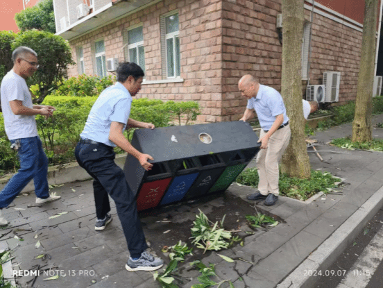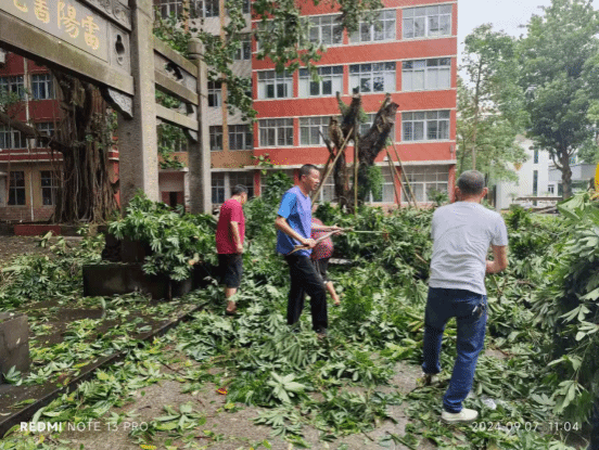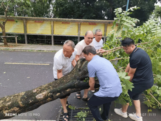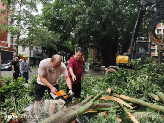 党员突击队员们分工明确,有条不紊地展开工作。有的手持扫帚清扫满地的落叶和杂物,有的则配合着大型清洁车辆,搬运沉重的树枝和垃圾。经过数小时的连续奋战,榕楼广场、日晷广场等区域校园主干道已基本恢复畅通,逐渐恢复了往日的整洁与美丽。