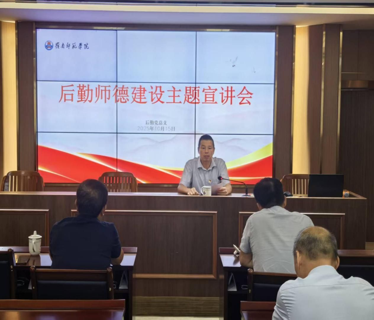 10月15日下午,后勤党总支在园府三楼会议室召开师德建设主题宣讲会。会议由后勤党总支书记李炳富主持,学校2025年优秀教师沈秀伟受邀担任宣讲嘉宾。