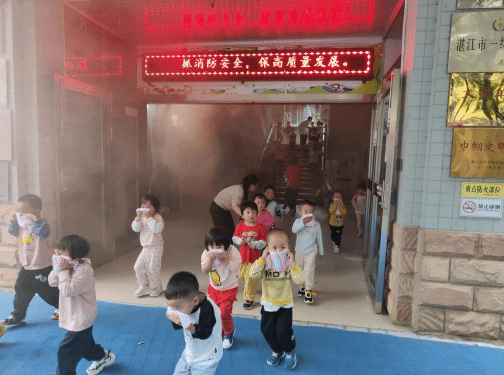 随着一声急促的警铃响起,幼儿园教学楼内烟雾四起,孩子们从容淡定,听着老师的指令,拿起湿毛巾,捂着口鼻,分别从三个指定出口跑到户外操场。整个过程安全,迅速,有序,达到了预期的效果。